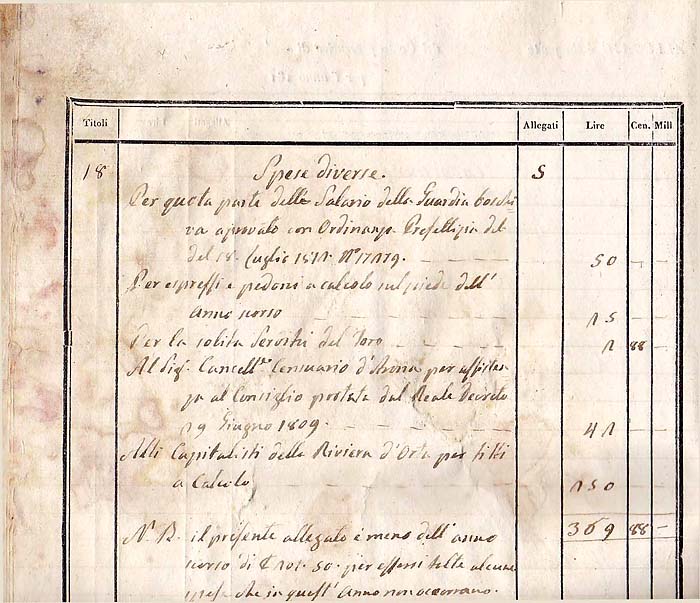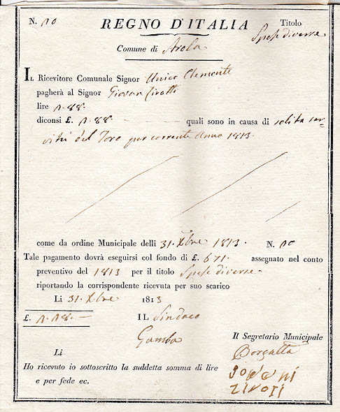 Jusqu'en 1818, le taureau communal était mis en location, chez un éleveur désigné par le conseil municipal moyennant une indemnité annuelle qui servait à l'entretien de la bête et à sa nourriture. Le 31 octobre 1813, le Receveur Communal Unico Clemente paie à Giovanni Zirotti la somme de Lire 1,88 sous le titre "Per la solita Servitù del Toro"(1) que l'on retouve dans le bilan communal de la même année à la rubrique "Spese diverse"(1). |