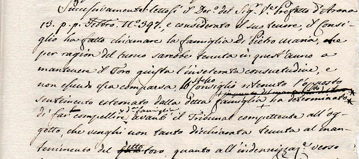 ... " Après lecture du Décret de Mr. le Préfet d'Arona n°397 du 13 Février 1806 et considérant sa teneur, le Conseil a fait appeler la famille Di Pietro Maria qui pour la raison de son "tour de garde" est tenu, pour cette année, de garder le taureau comme le veut la juste tradition, et n'ayant pas comparu devant le conseil, celui-ci a retenu le refus exprimé par cette famille et a décidé de la faire comparaître devant le tribunal compétant au motif qu'elle n'est pas venue faire cette déclaration pour le maintien dudit taureau" ... |