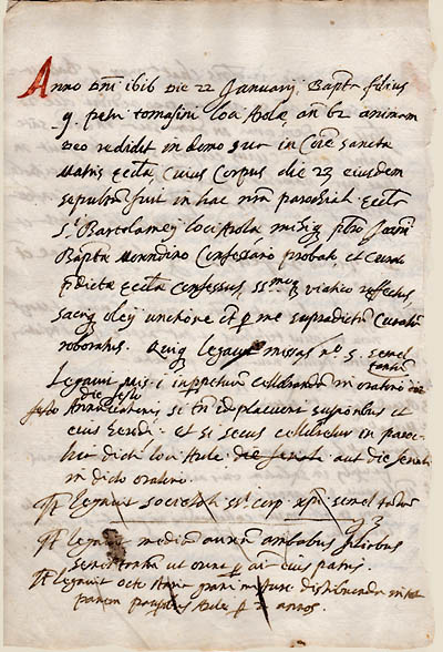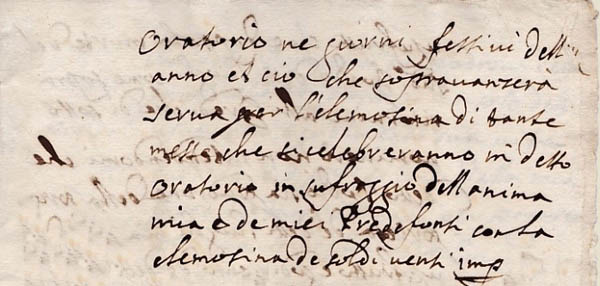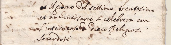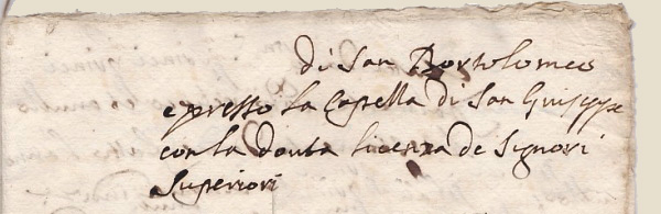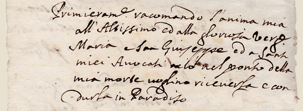 Dans la longue série des invocations, la Vierge Marie vient toujours en seconde position, elle représente un des meilleurs moyens d'atteindre le Christ, son fils, et donc Dieu. Après la Vierge Marie viennent les Saints et Saintes. Le culte des saints est l'une des caractéristiques du Christianisme. En 1563, après le Concile de Trente, est publié un décret, par l'intermédiaire de Carlo Borromée, sur "De invocatione, veneratione, et reliquiis sanctorum, et sacris imaginibus"(2), dans lequel l'Eglise réaffirme que le Christ est le seul rédempteur et sauveur, mais également que l'invocation des saints est bonne et utile car ils peuvent demander à Dieu des bienfaits pour les fidèles, ils sont donc des intercesseurs efficaces. Parfois le testateur invoque un saint qui est vénéré comme Saint-Patron, comme protecteur d'une église..... Ici Giulio Ceruetti fait appel à Saint Joseph. |