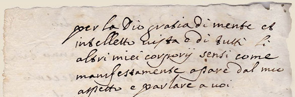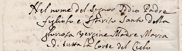 Cette formule rappelle la trinité de Dieu à laquelle le testateur associe la "Glorieuse Vierge Marie", mère du Christ, et les Saints et Saintes du paradis "tutta la Corte del Cielo" ainsi il témoigne son appartenance à la communauté religieuse chrétienne, ce qui explique la présence de cette formule en début du texte." |
