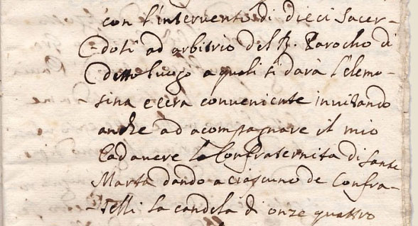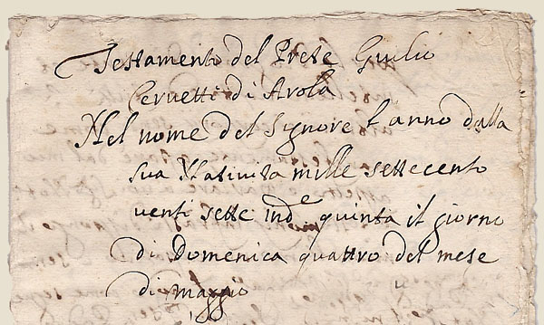 soit plus fréquemment par un notaire ( testament de Don Giulio Ceruetti et prêtre de Arola en 1709) , qui nous servira ici de document de référence. Le testament est un acte à la fois civil et religieux, mais aussi de prévoyance et de prudence car il est, pour les hommes de cette époque, leur dernière chance de gagner leur place au paradis; ils y affirment leur foi et leur amour en Dieu, ils y expliquent l'organisation de leurs funérailles et le lieu de leur sépulture, ils y réclament des prières, y font des aumônes aux pauvres et des donations à l'église. |