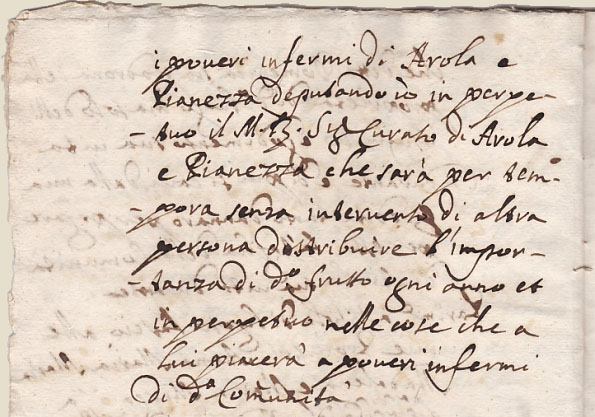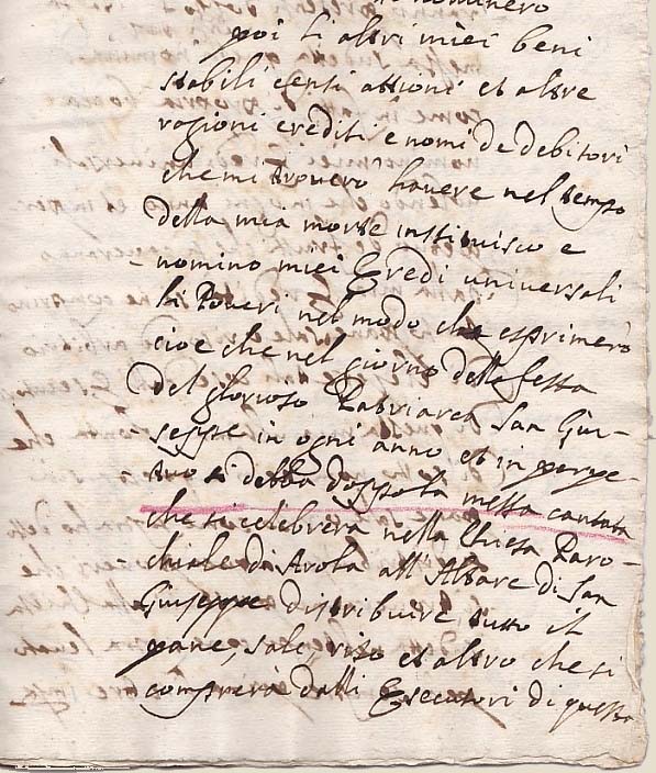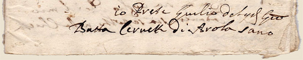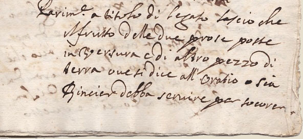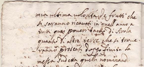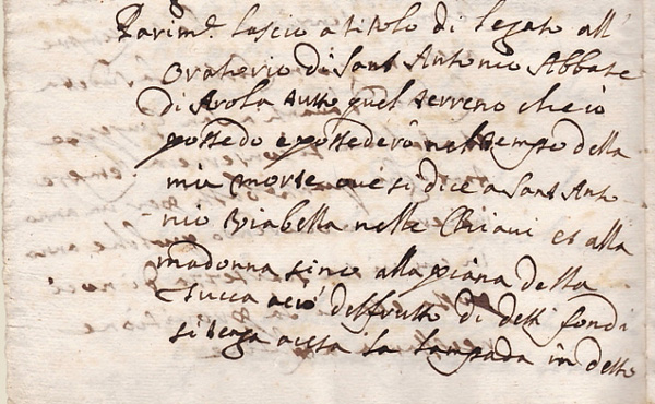 | Dans son testament Giulio Ceruetti fait également des donations pieuses à l'Eglise, telles que ces terrains situés " in Versura " et " Rincier " afin que l'usufruit soit distribué par le Curé de la paroisse aux infirmes de la Communauté de Arola et Pianezza. |