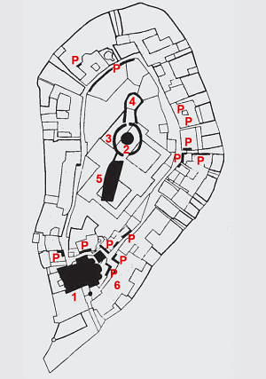 Sur le plan du cadastre Rabbini (1864), on peut noter la présence des vestiges des constructions médiévales dans le tissus urbain de l'île St. Jules. 1- Basilique primitive 2- Tour du chateau (Castrum) 3- Enceinte du chateau 4- Gibet 5- ?? 6- Lieu de la découverte des sarcophages en 1688 P- Portail et parement muraux début du Moyen-Age |