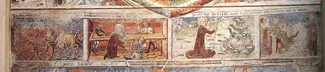 On croit également qu'ils seraient d'abord passés par la montagne, venant du Lac Majeur car la tradition veut qu'ils aient érigé d'abord les églises, aujourd'hui paroissiales, d'Armeno et d'Ameno. Arrivés à Gaudanum, l'actuel Gozzano, un bourg très ancien, ils décidèrent de fonder, avec la collaboration des habitants, une nouvelle église qui sera dédiée en 1141 à St. Laurent martyr, « la quatre-vingt-dix neuvième », qui subsiste encore aujourd'hui, en partie dans sa structure ancienne. Là, on raconte que plusieurs miracles attribués à St. Jules auraient eu lieu. Il est certain que St. Jules a occupé une place plus importante dans les croyances et légendes des populations de la région du Cusio, par rapport à celle de son frère. Il commença par rattacher le pouce d'un maçon qui s'était accidentellement blessé avec une hache, comme le raconte l'une des fresques de la Trinité datant du XV siècle et conservées dans la nef gauche de la basilique de St. Jules d'Orta. On raconte également qu'un char, tiré par deux bœufs, transportait des matériaux pour la construction de l'église, lorsqu'un loup surgit de la forêt et se jeta sur l'un des bœufs, le tuant pour le dévorer. Aux cris des conducteurs de bœufs, les saints frères intervinrent, et St. Jules ordonna au loup, au nom du Seigneur, de se joindre au char à la place du bœuf tué. Et, miracle ! Le loup obéit et continua à travailler à la construction du temple. Un tableau dans la basilique de l'île illustre cette scène. |