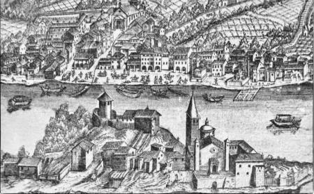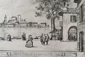 Estampe d'après une gravure sur cuivre de J. Ozeni de Soriso. Dessin du Sacro Monte de St. François de Orta et de l'île St. Jules en 1624 vu de la rive ouest. Sont mis en évidence le Chateau (Castrum) au sommet de l'île et au pied de l'éperon rocheux une partie de l'habitat sur la rive ouest. |