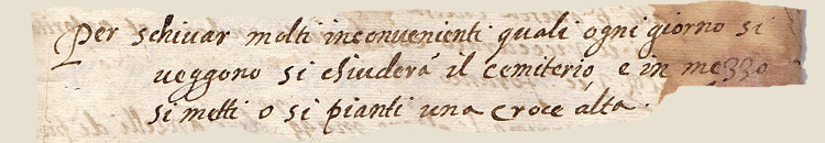 | ... Le cimetière sera clos par des murs hauts de sept "Cubiti" (3,90m environ) fermé par de solides portes munies de battants garnis de verrous, il sera propre, sans végétation (...); en son centre, on placera une croix sur une haute colonne de pierre ou de bois. A l’intérieur du cimetière, un "ossuaire" sera construit, entouré de murs et couvert d’un toit à "volta", à la vue de tous, où seront placés, en bon ordre, les ossements des défunts exhumés ... | ||||||