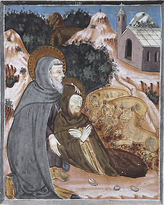 Cet épisode fera la célébrité de l’anachorète. Bientôt il eu des doutes sur l'utilité d'une telle vie solitaire. Il consulte d’autres ermites qui l’exhortent à persévérer, lui conseillent de se détacher encore plus radicalement du monde. Alors, couvert d’un simple tissu, il habite dans une tombe creusée dans une forteresse aux alentours du village de Come où le démon envoie des bêtes maléfiques qui l’attaquent et le frappent, le laissant pour mort. En 285 il part vivre sur le mont Pispir, dans un fortin romain abandonné en plein désert sur la route de la Mer Rouge. Il y restera 20 ans, se nourrissant seulement de pain qu’on lui apportait deux fois par an. Là, il continue sa recherche de purification totale, et selon la légende, en étant toujours aussi tourmenté par le démon. |